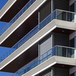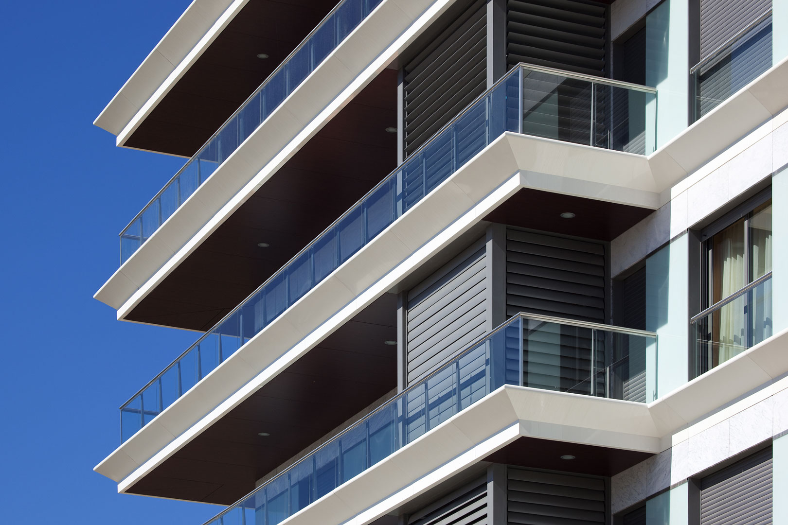 Between floors we used small lacquered aluminum consoles in white, that not only accentuate a more horizontal reading of the building, but also help to stay in the regulations of fire safety between floors.