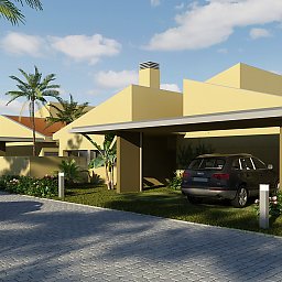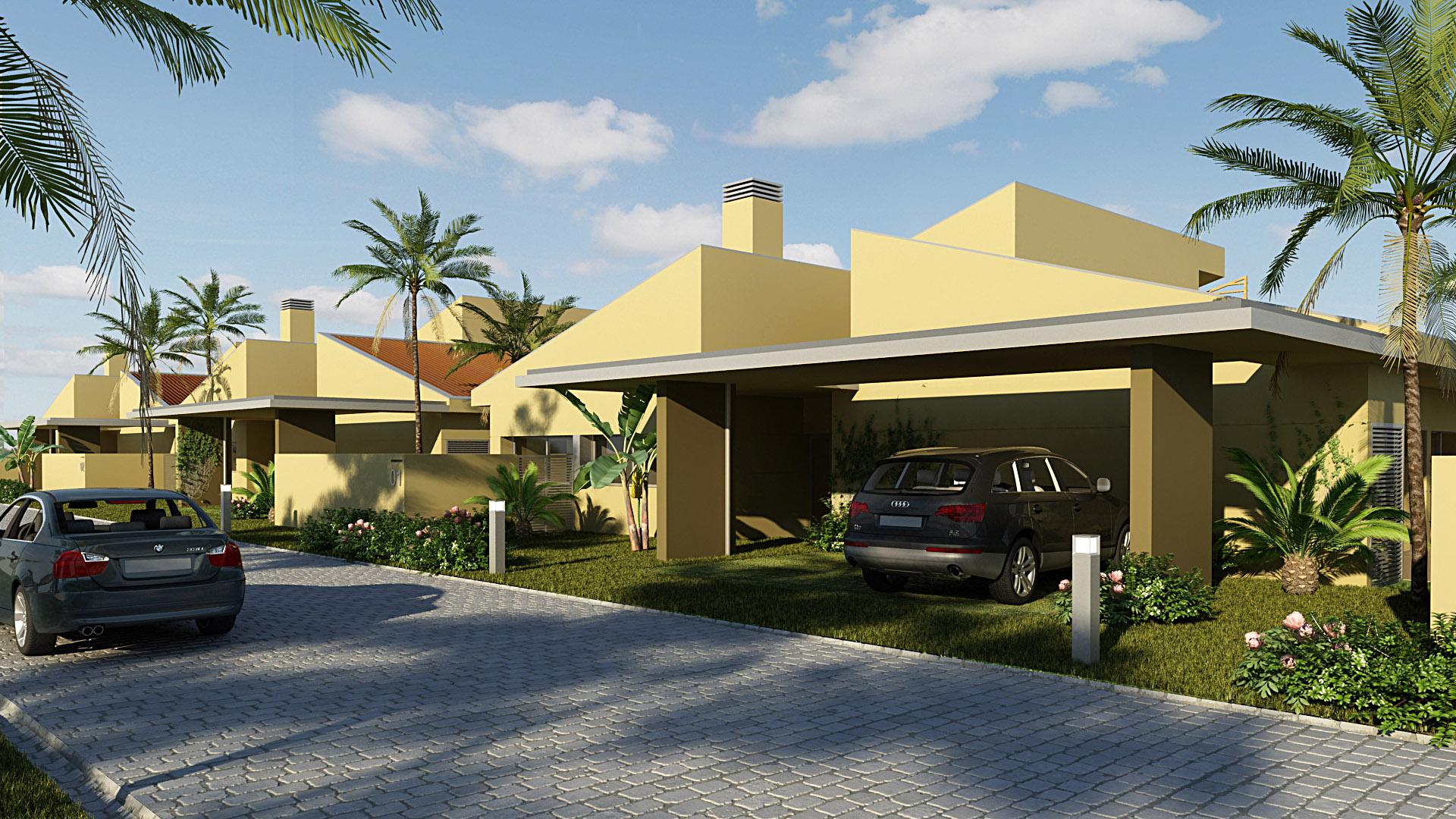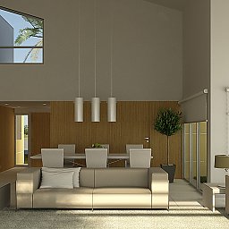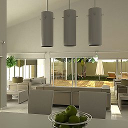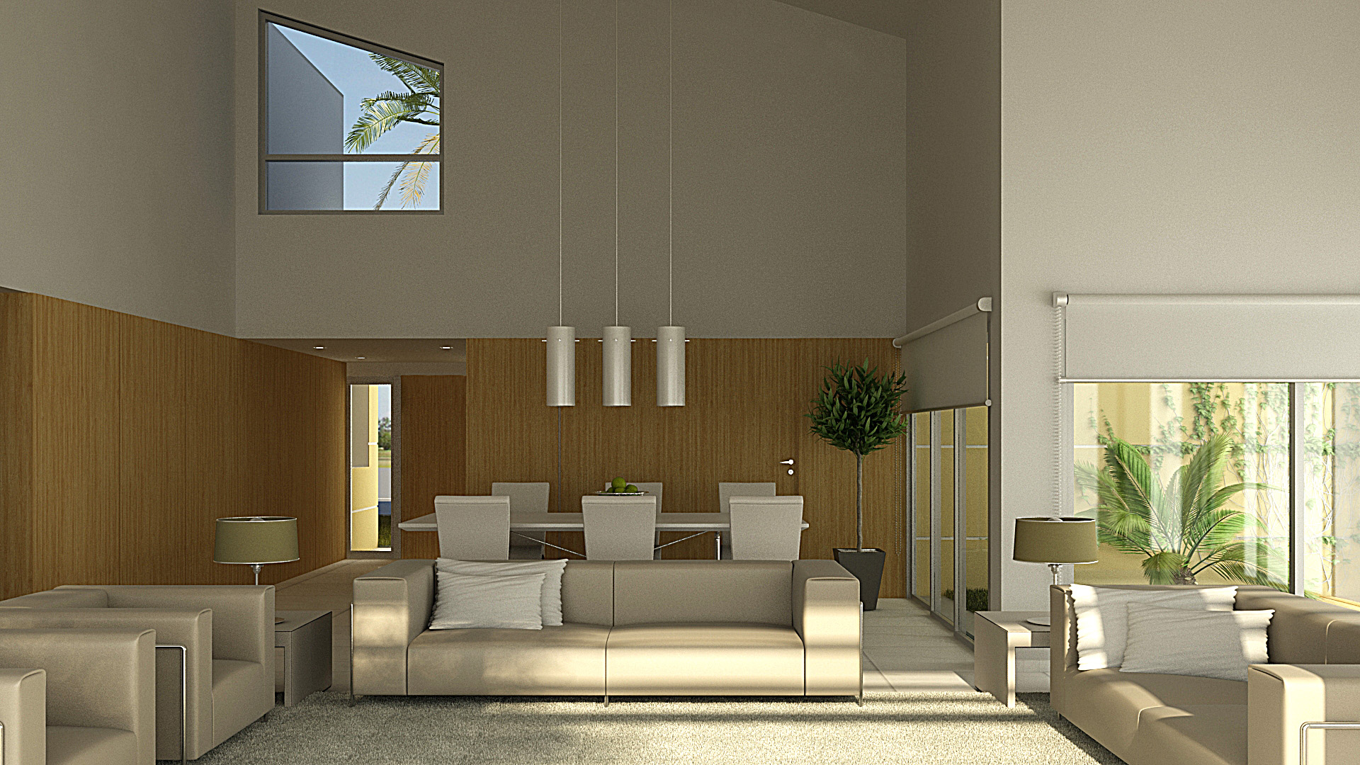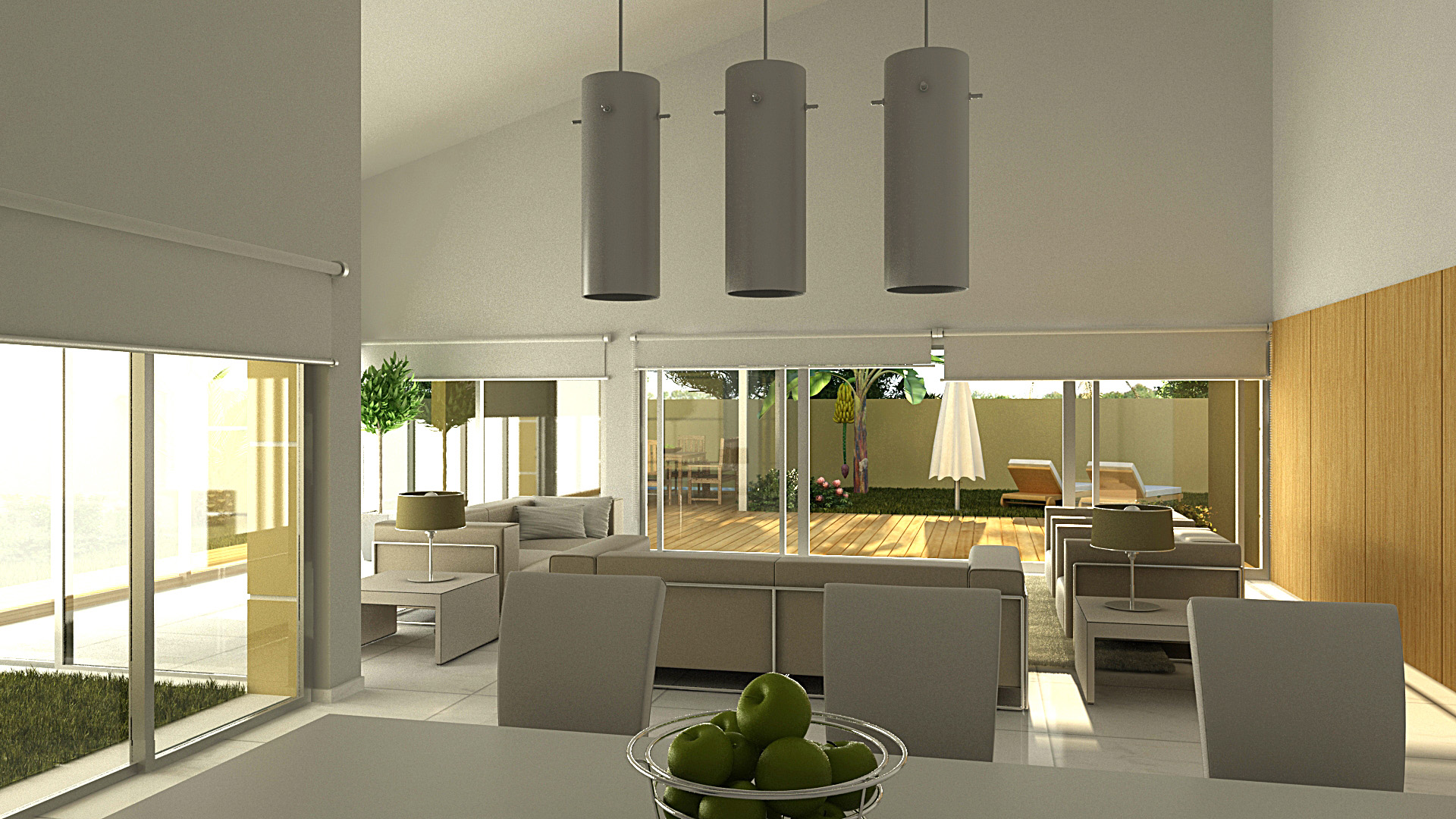 In the Interior, the purpose was to use a strong visual relation with the private outdoor patios in the back, keeping the traditional separation between living areas and the room areas.