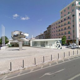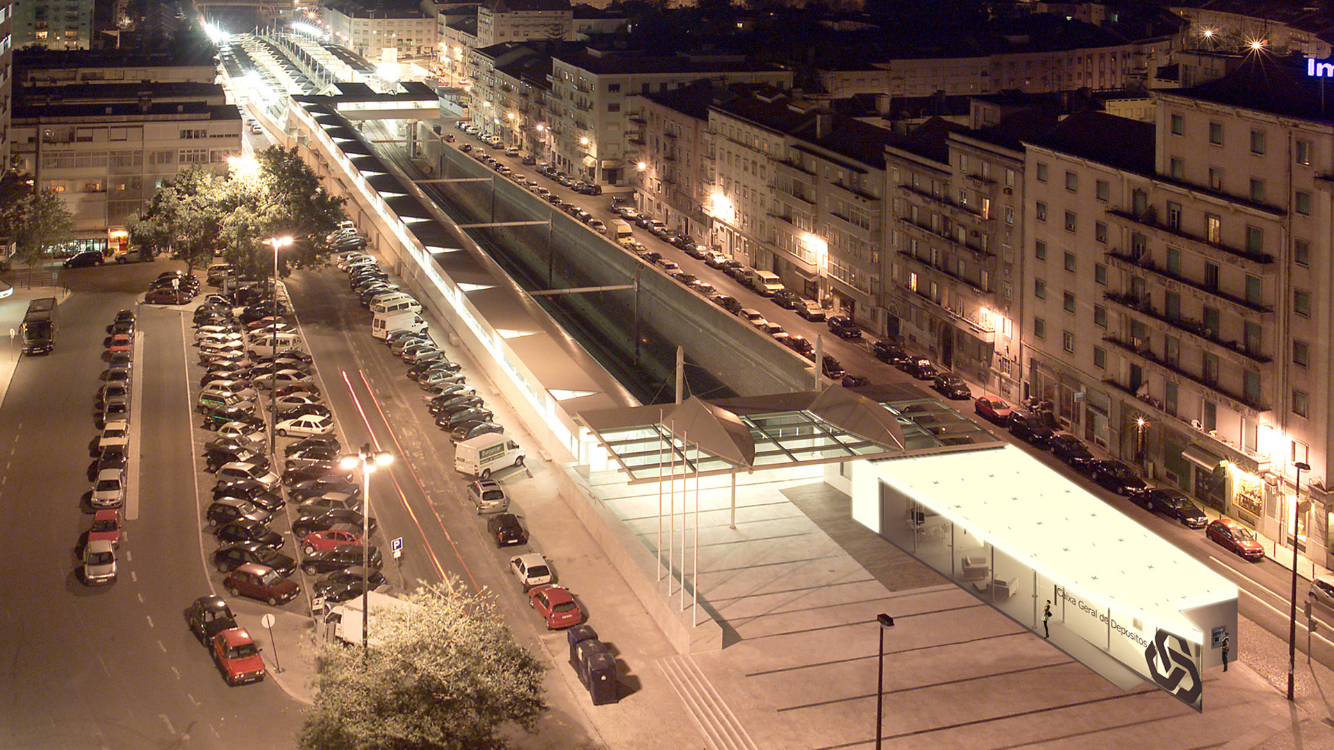 The new pavilion is still strongly characterized by a large logo inserted at the apex of glass which mark the shape of the side of the Avenida de Roma.