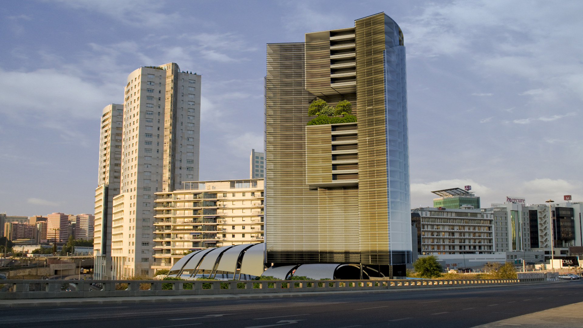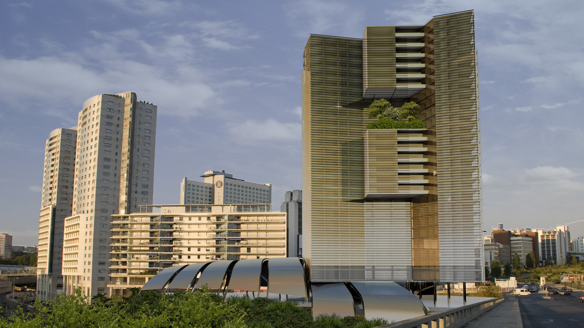 The foundation that solves the street gap involving the plot, and allow the entrance to the private parking at the level of the basement with the 2nd lower floor, has in the exterior a gardened area, partially covered with structural elements that give formal continuity between this foundation and the housing tower.