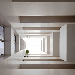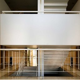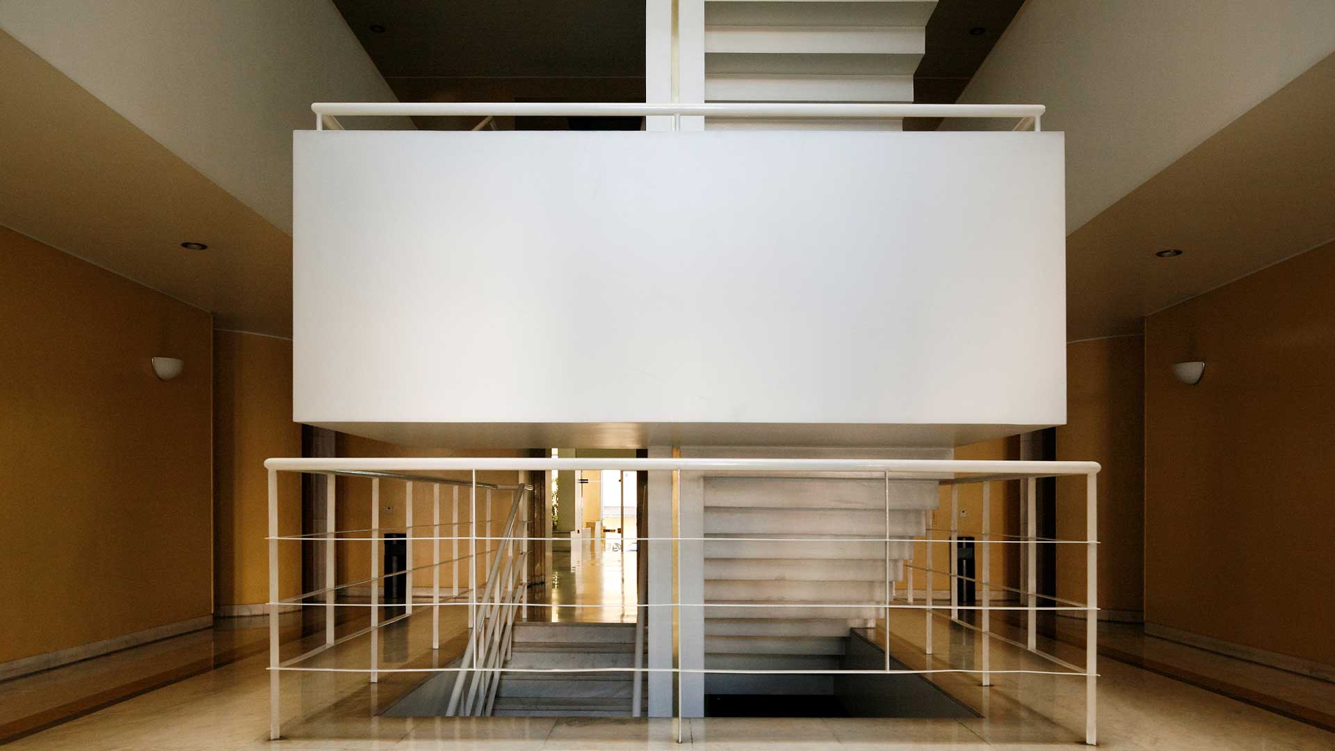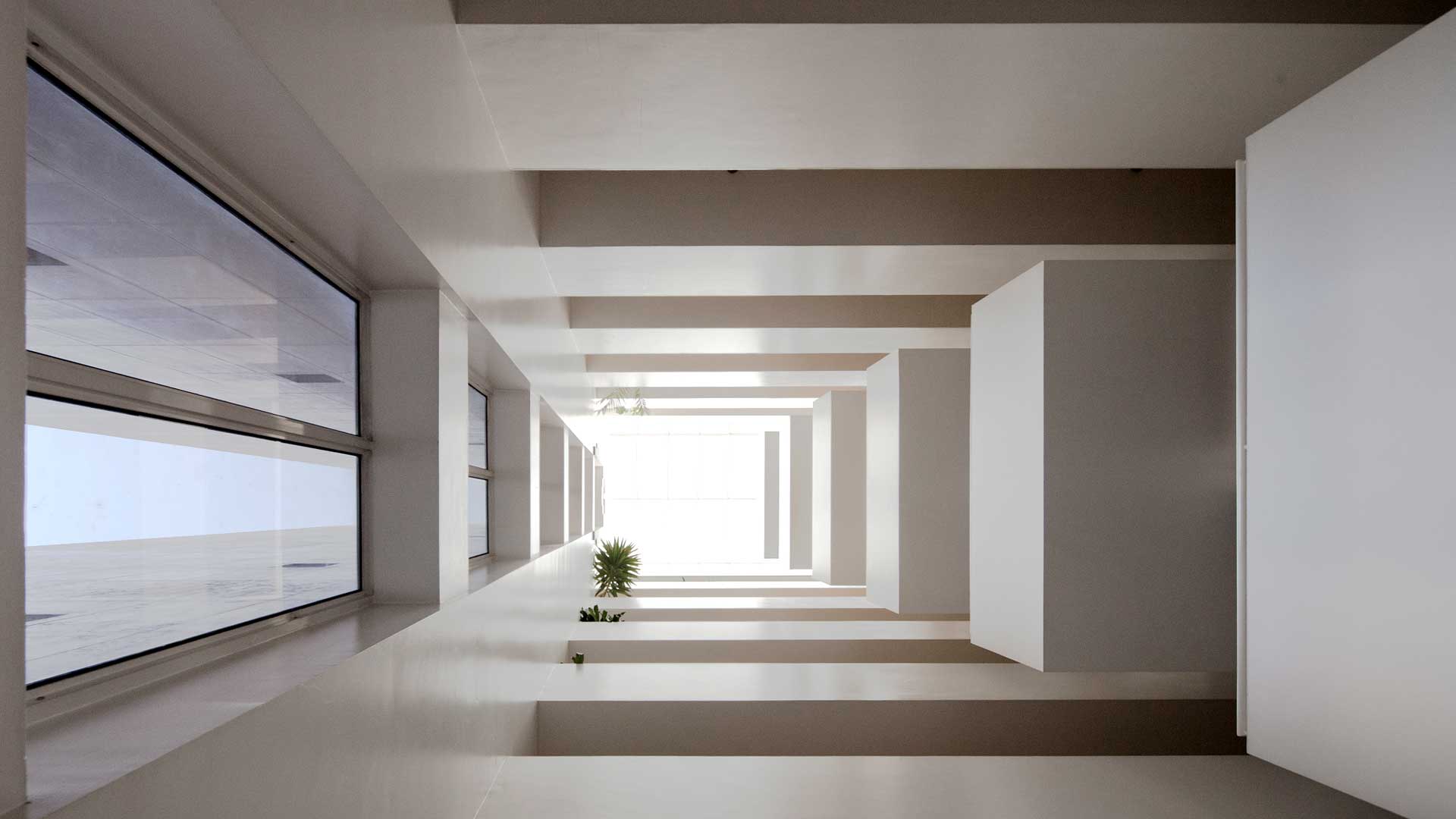This foundation is implanted in the lot at half height of the outer dimensions, allowing an easy access to parking in the basement and the ground floor of both buildings, creating between them an outdoor terrace punctuated with small palm trees, benches and a Central bowl with water.